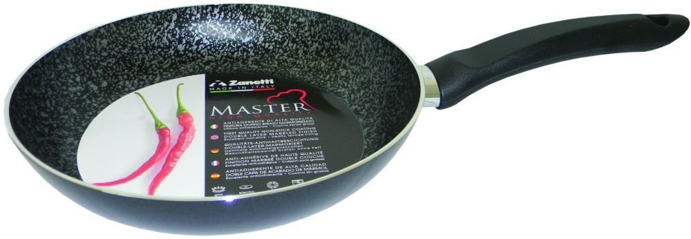 Wysokiej jakości patelnie włoskiej produkcji Zanetti - nadają się na kuchenkę elektryczną, gazową i płyty ceramiczne. Można myć w zmywarce. Powierzchnia patelni wykonana jest z wysoce odpornej nieprzywierającej powłoki GREBLON. Patelnie Zanetti są produkowane w tradycyjnej włoskiej firmie rodzinnej i charakteryzują się bardzo wysoką jakością wykonania. Linia Master - grubość ścianki 3 mm, zewnętrzny kolor metaliczna czerń, marmurkowana powierzchnia patelni, spawana rączka.