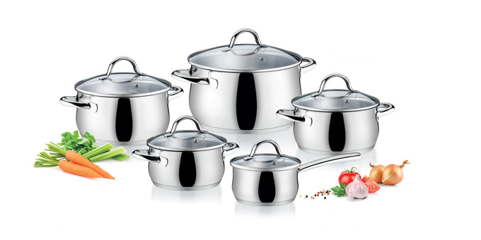 Kuchyňské nádobí se sklonerezovými poklicemi, masivními vodotěsnými úchyty, třívrstvým sendvičovým dnem a odměřovací stupnicí v každé nádobě. Vyrobeno z prvotřídní nerezavějící oceli 18/10, vhodné pro všechny typy sporáků - plynové, elektrické, sklokeramické a indukční, vhodné do myčky. 5 roků...