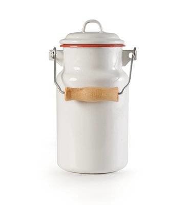 Emaliowany dzbanek do mleka z czerwonym rantem. Ø10 cm, wysokość 22 cm, pojemność 1 l. przeczytaj całość