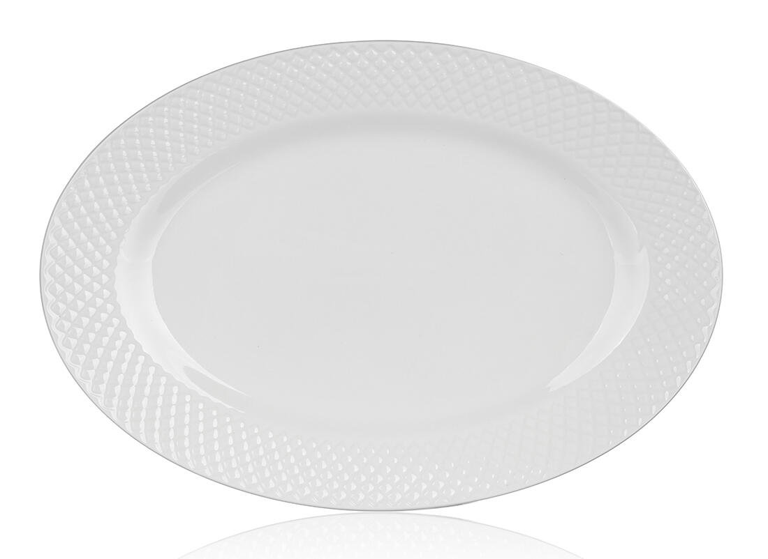 Talerz o wymiarach 34,5 x 24,2 cm wykonany jest z wysokiej jakości ceramiki w eleganckim białym kolorze z subtelnym dekoracyjnym reliefem, który nada potrawom stylowego wyglądu. Nadaje się do codziennego użytku domowego, a dzięki trwałości materiału można go bez obaw włożyć do mikrofalówki w celu szybkiego podgrzania jedzenia.