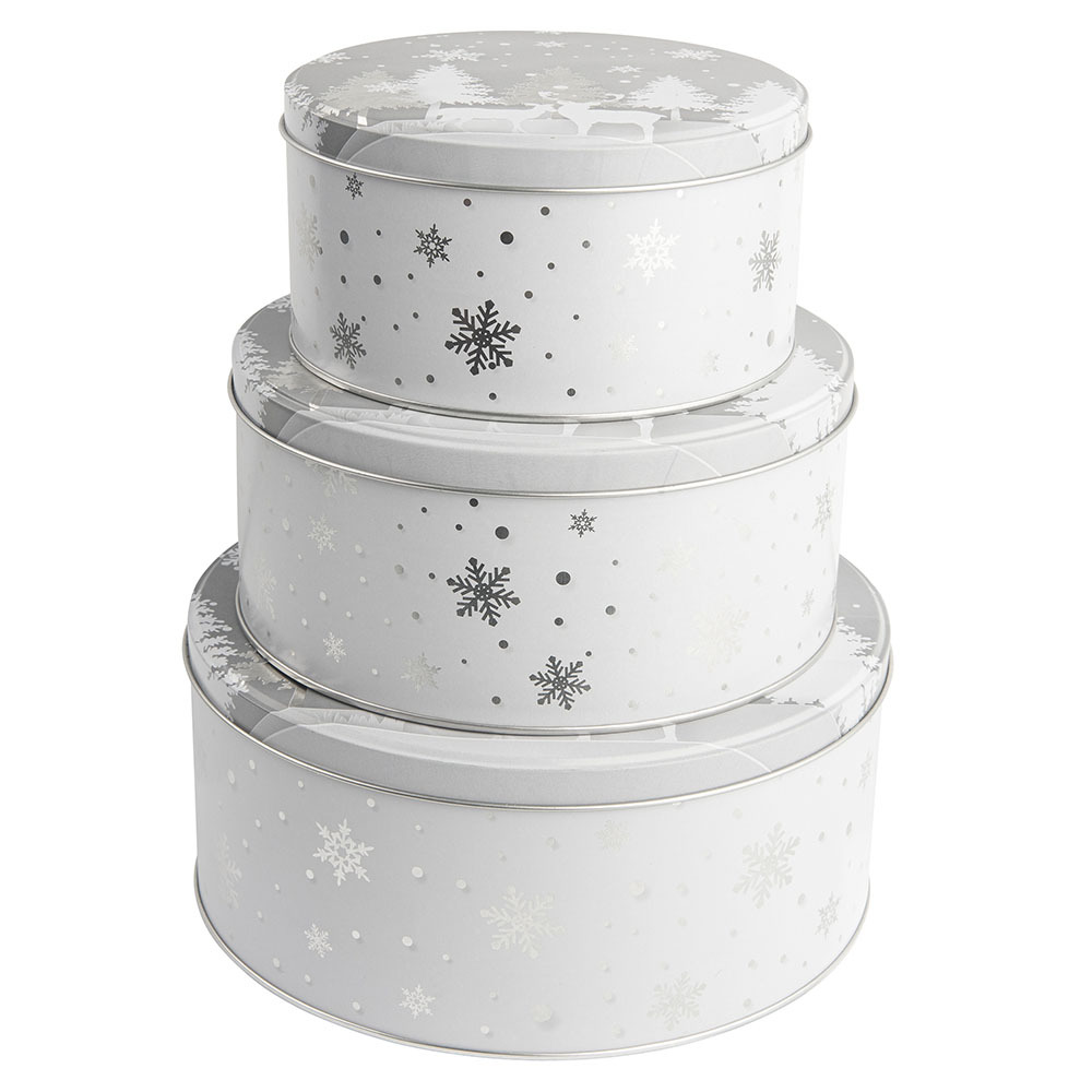 KRUHOVÉ PLECHOVKY 3 KUSY 20X9CM 17X8CM 14X7CM OZDOBENÉ STŘÍBRNÝMI STROMEČKY
