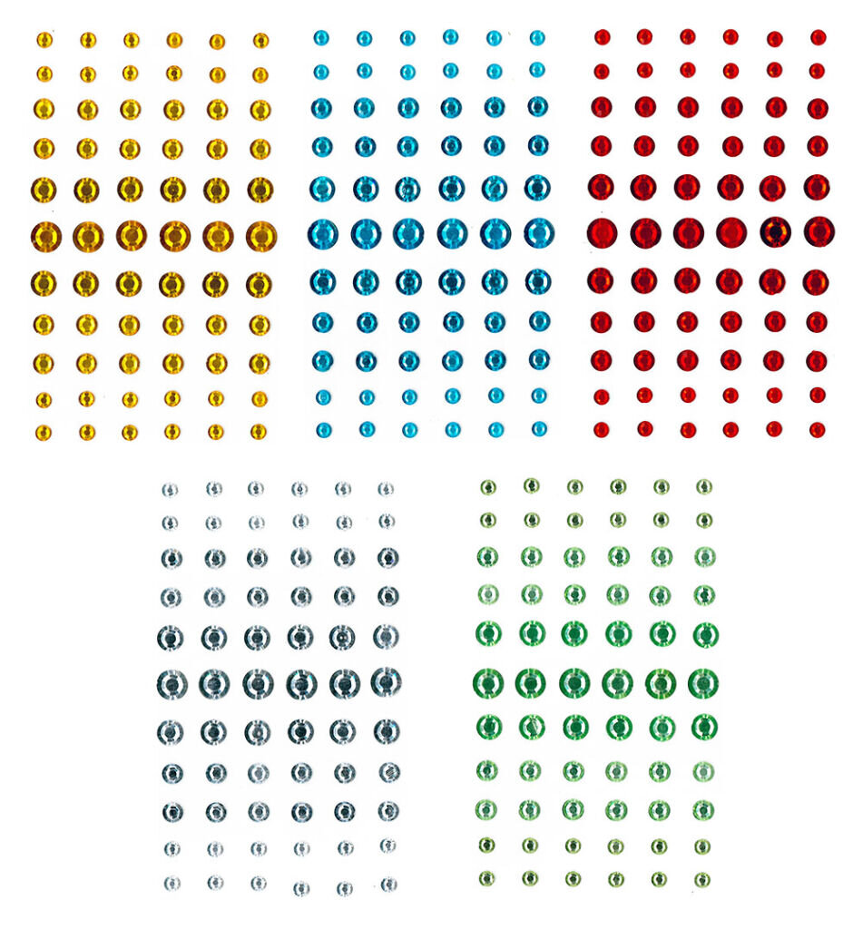 Nalepovací kamínky - plastové, 5 barevných provední (bílá, červená, zelená, modrá, žlutá), jedno balení obsahuje 1 barvu. przeczytaj całość