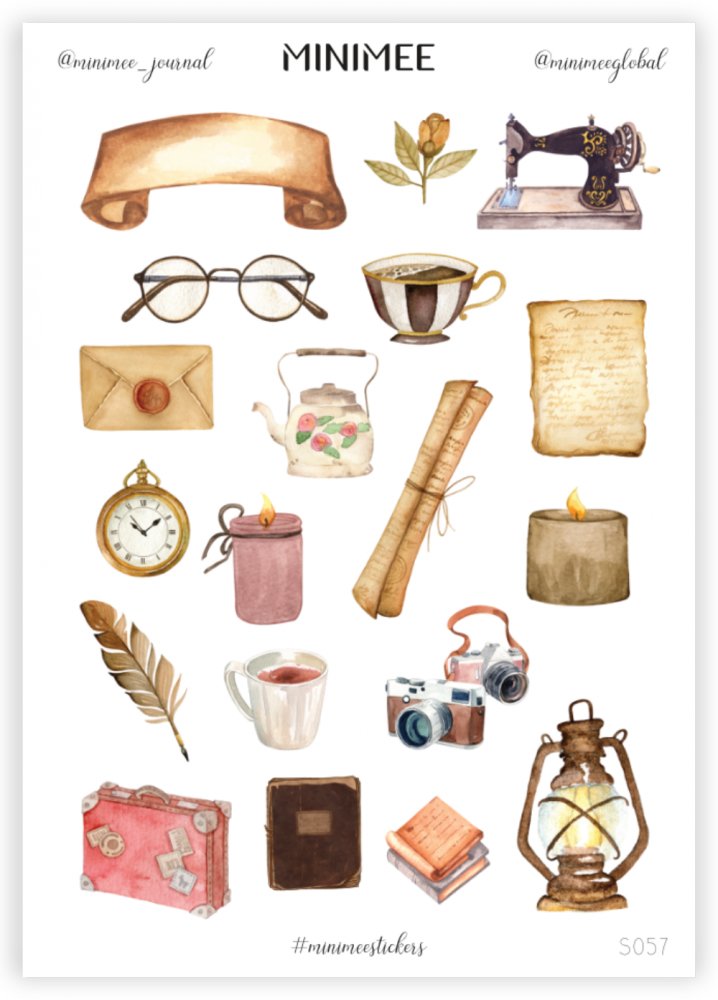 Piękne wycinane naklejki na arkuszu A5, które przyciągają uwagę nie tylko swoim wzornictwem. Doskonale pasują do papieru notesu MINIMEE. Wysokiej jakości biała naklejka o matowym, naturalnym wyglądzie. Arkusz jest wykonany w popularnym stylu vintage. Zawiera zestaw naklejek z motywami książek, świec, zegarów i papierów. Wyprodukowano w Czechach.