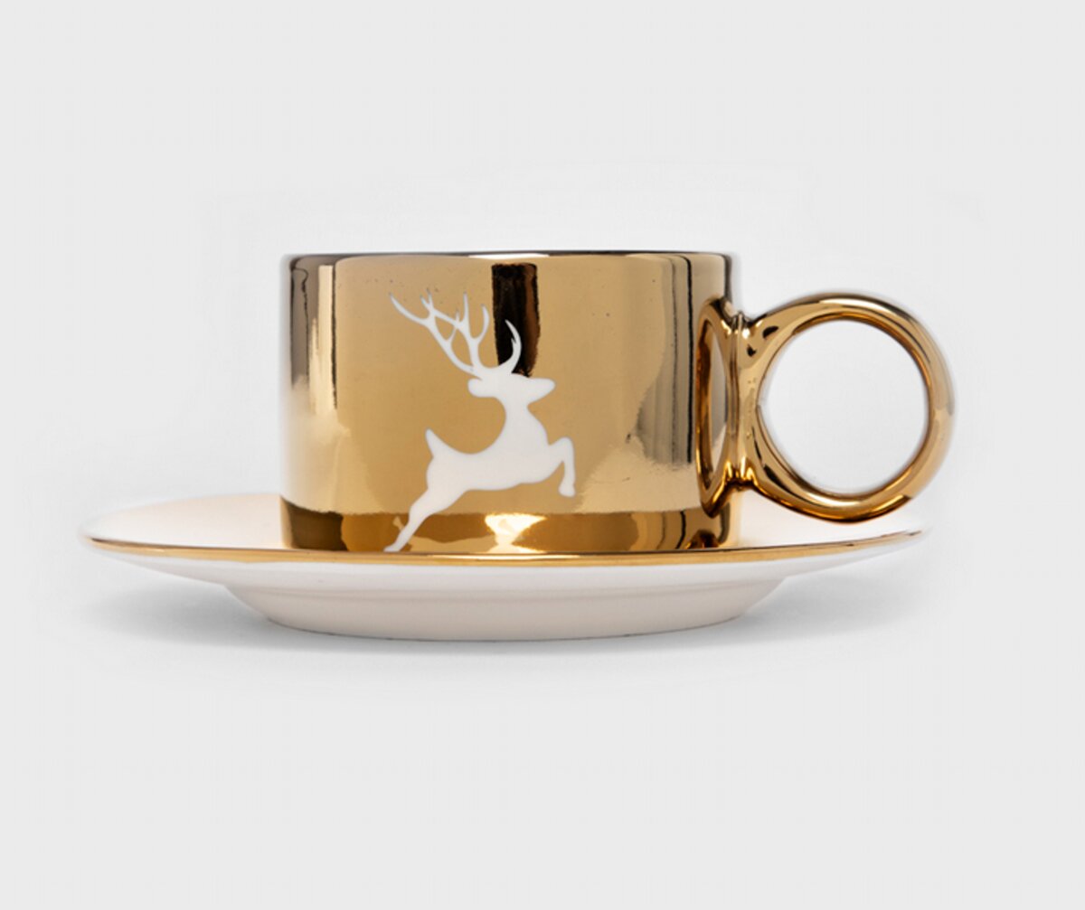Vánoční šálek | FEHER | 6x8 cm zlatý s jelenem a podšálkem | 713019
