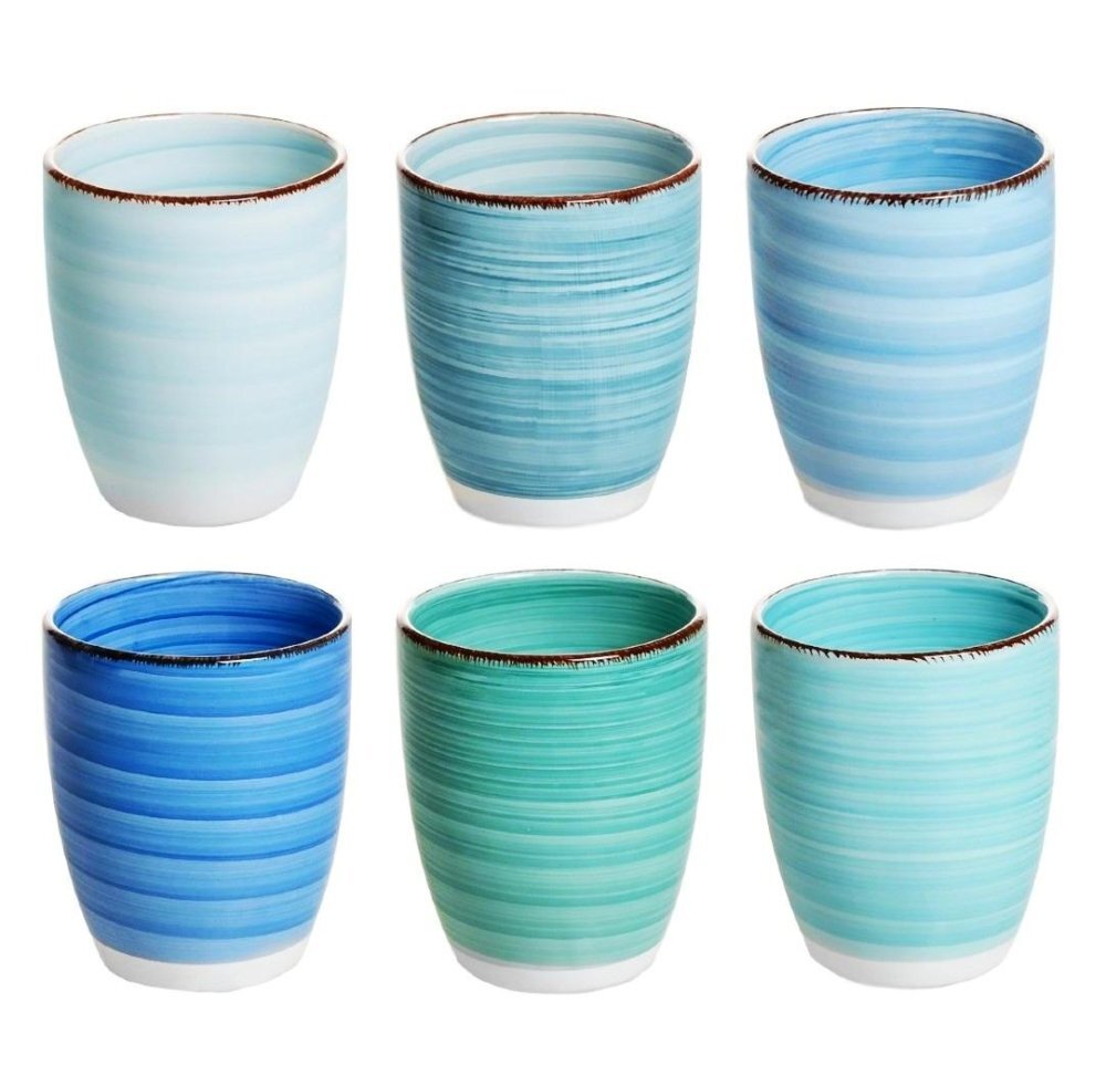 Ceramiczny komplet niebieskich filiżanek bez ucha AZURE - 6 x filiżanka do kawy i herbaty. Ten zestaw zawiera sześć filiżanek o pojemności 350 ml, w różnych kontrastujących odcieniach niebieskiego. Wnętrze filiżanek jest kolorystycznie szkliwione na barwę filiżanki. Delikatne pastelowe kolory i wyjątkowy design tego zestawu nadadzą każdemu Twojemu rytuałowi kawowemu lub herbacianemu nutę przytulności. Zestaw wykonany jest z wysokiej jakości ceramiki, odpornej i łatwej w czyszczeniu. Idealnie nadaje się zarówno do codziennego użytku, jak i na specjalne wizyty. Piękny komplet kubków jest również doskonałym prezentem na każdą okazję. Nadaje się do kuchenki mikrofalowej, zmywarki oraz lodówki.