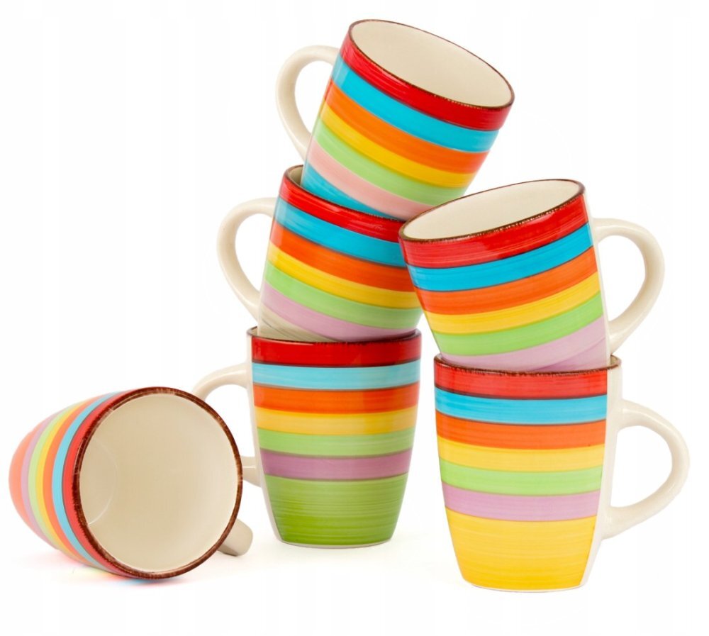 Ceramiczny zestaw kubków IBIZA - 6 x kubek do kawy i herbaty.Ten zestaw zawiera sześć kubków o pojemności 350 ml, wszystkie w kolorowym wykonaniu z różnymi kolorowymi paskami. Wnętrze kubków jest białe. Delikatne pastelowe kolory i unikalny design tego zestawu dodadzą każdemu Twojemu rytuałowi kawowemu lub herbacianemu nuty przytulności. Zestaw wykonany jest z wysokiej jakości ceramiki, która jest trwała i łatwa w czyszczeniu. Świetnie nadaje się zarówno do codziennego użytku, jak i na specjalne wizyty. Zestaw pięknych kubków jest również doskonałym prezentem na każdą okazję. Nadaje się do kuchenki mikrofalowej, zmywarki oraz lodówki.