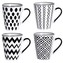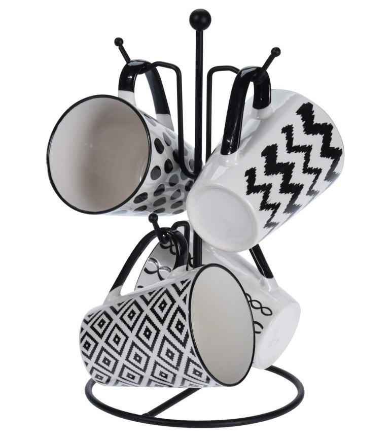 MUG SET OF 4PCS IN METAL RACK. STONEWARE, 310ML/ 10,48OZ, DIA 85X115XH105MM. METAL RACK POWDER COATED IN BLACK COLOUR WITH 4 ASSORTED BLACK DESIGNS IN ONE SET WITH BLACK HANDLE AND BACKSTAMP IN OUR DESIGN COLOUR BOX/ 215X165X290MM, Colour Box: 1 IN RACK:, Metal, Black, 1X1X1MM,4 X pcs Mug 310ml, Pottery, Black/White, 115X85X105MM / CFT 1,73,(5.401/40ft HQ)