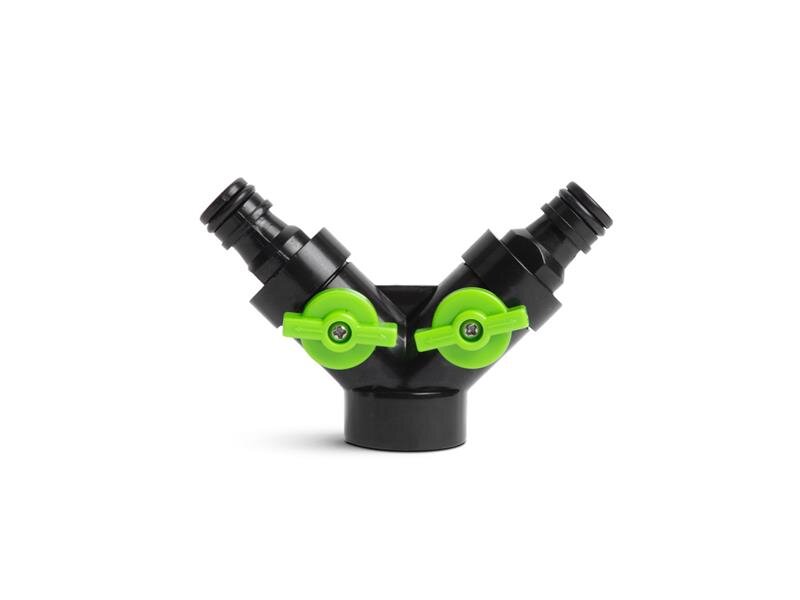 Rozbočovač ve tvaru "Y", který lze instalovat na zahradní kohouty s vnějším závitem a hadicové spojky, který má pro každou větev uzavírací ventil.