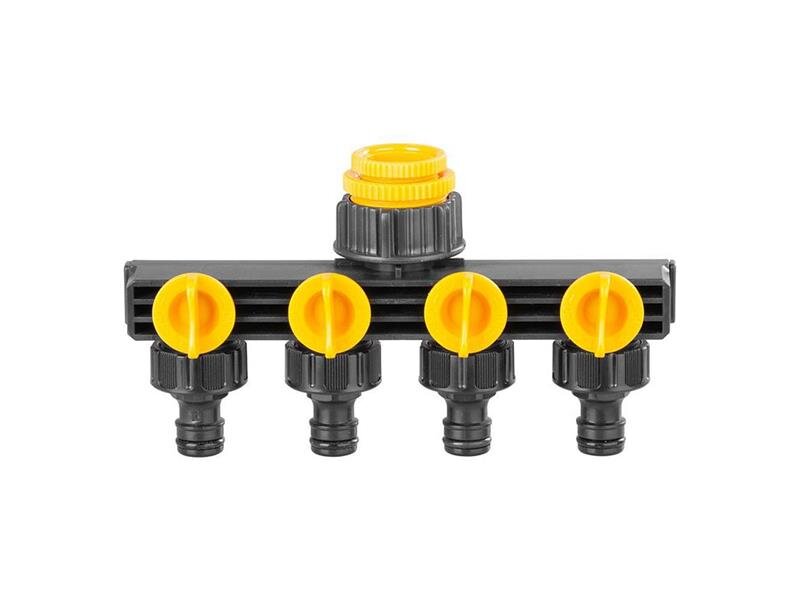 4-cestná zahradní rozvodka pro připojení k vodovodnímu kohoutku.Možnost připojit až 4 vodovodní příslušenství.Průtok vody je regulovatelný a uzavíratelný.Vhodné pro 1/2" - 3/4". przeczytaj całość