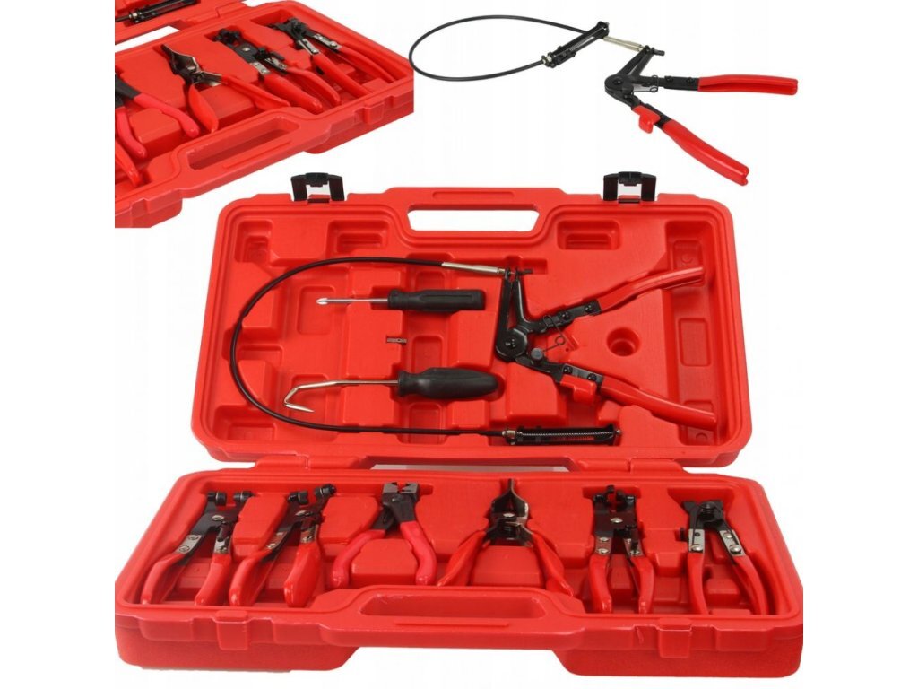 Sada kleští na hadicové spony obsahuje celkem sedm kusů různých kleští a součástí sady je také šroubovák s výměnnou rukojetí a odstraňovač hadice se speciálními háky. Vše uloženo v praktickém kufříku. Kleště jsou snadno ovladatelné jednou rukou, izolované rukojeti se dobře drží.
