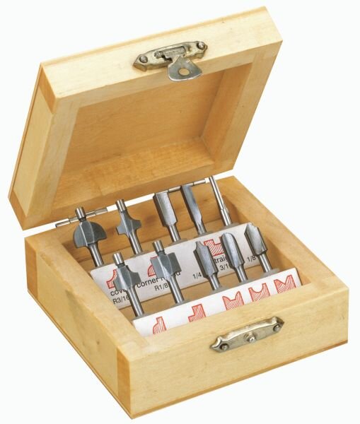 Zawartość:frezy palcowe 3.2 – 4.8 – 6.5mm,frez zaokrąglony 6.4mm,frez rowkowy w kształcie V 6.5mm,frez rowkowy 6.5/2.5mm,frez ćwierćwałkowi R 3.2mm,frez wpustowy 6.4mm,frez kantowo-łukowy 5mm,frez kątowy 45°. W estetycznym drewnianym pudełku. przeczytaj całość