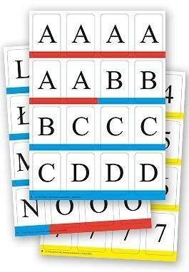 Zestaw kartoników z literami, cyframi i znakami matematycznymi oraz zamykany na rzep klaser do ich przechowywania. Wielkie i małe litery drukowane z kolorystycznym oznaczeniem samogłosek i spółgłosek ułatwiają naukę tworzenia i odczytywania sylab i wyrazów. Kartoniki z cyframi 0-9 i liczbą 10...