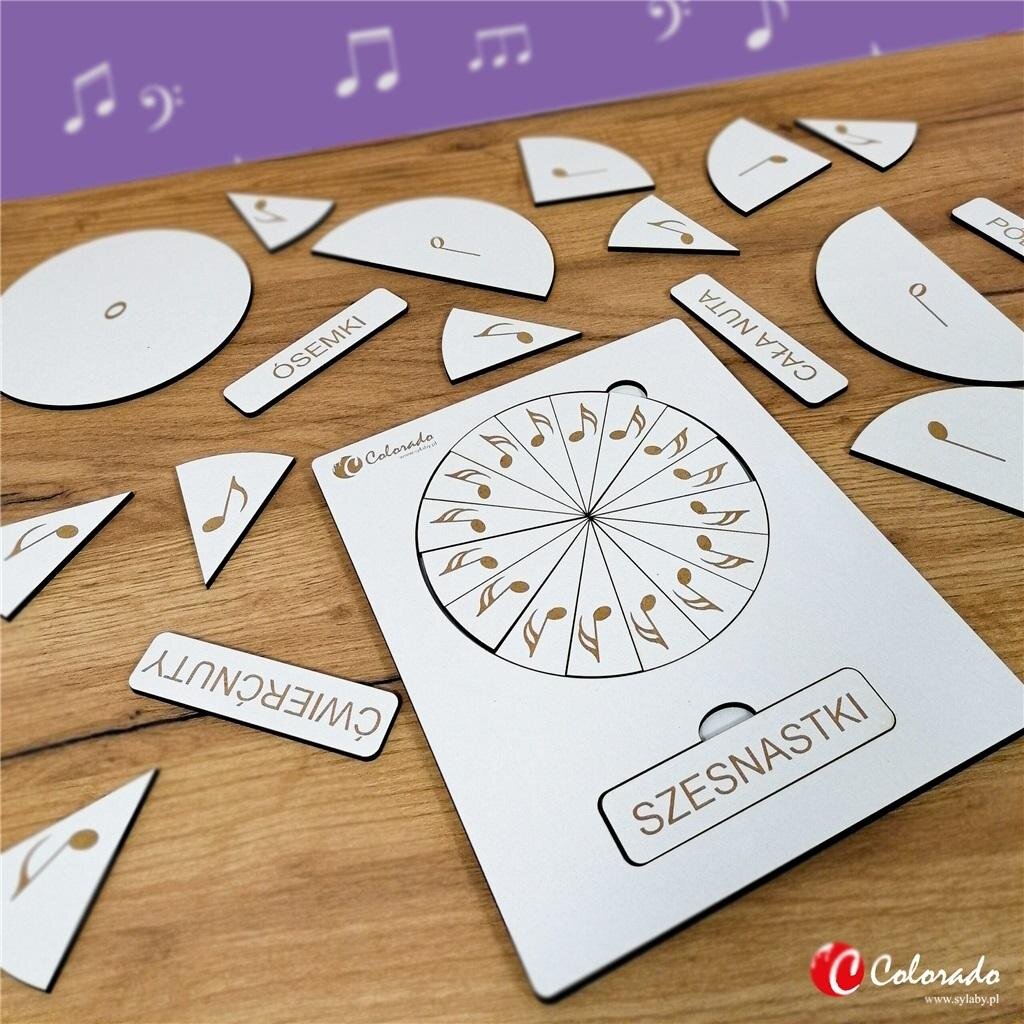 Zestaw składa się z tabliczki drewnianej z wygrawerowanymi laserowo wartościami rytmicznymi nut oraz ich nazwami.