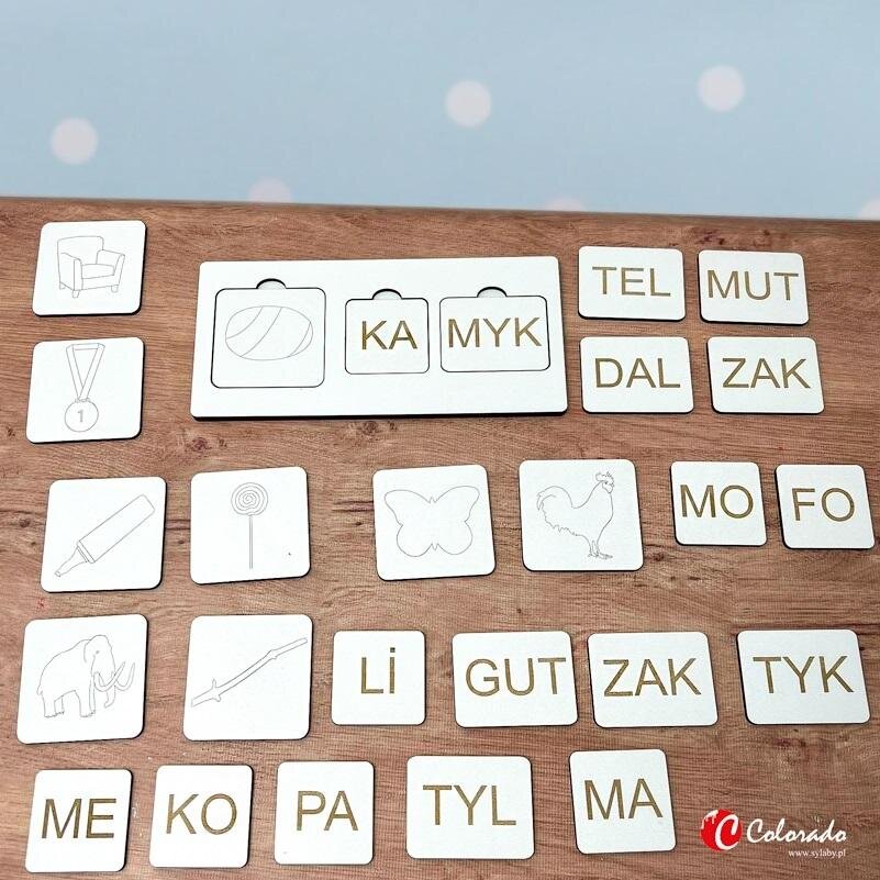 ZESTAW DO NAUKI CZYTANIA UKŁADANKA SYLABOWA CZ.6Ilość: 27 elementów: 9 płytek z obrazkami (lizak, mazak, kogut, motyl, fotel, patyk, mamut, medal, kamyk), 17 płytek z sylabami otwartymi prymarnymi i zamkniętymi oraz podstawą bazową, przeczytaj całość