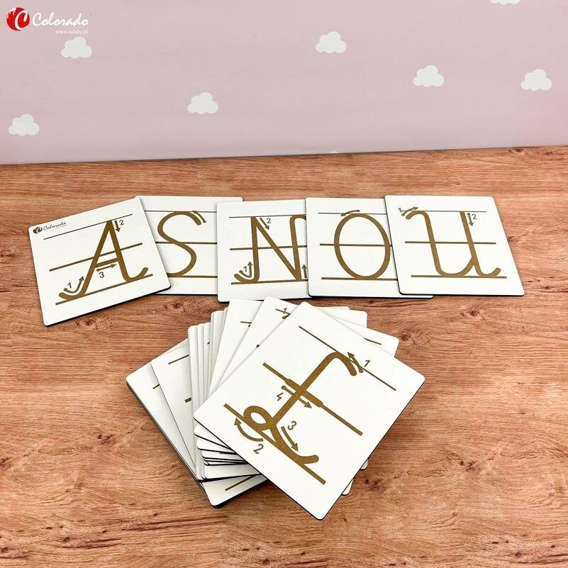 Prezentujemy drewniany alfabet do nauki pisania. Alfabet składa się z tabliczek drewnianych o wymiarach 16 cm na 14 cm. Na każdej tabliczce wygrawerowana jest litera w liniach (jak w zeszycie) wraz z prawidłowym kierunkiem jej pisania. Zestaw zawiera 24 tabliczki A, B, C, D, E, F, G, H, I, J, K,...