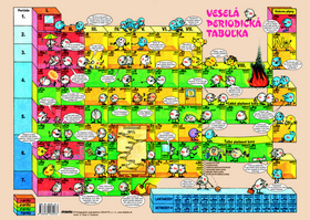 Farebne ilustrovaná tabuľka humornou formou podáva vlastnosti jednotlivých prvkov.
