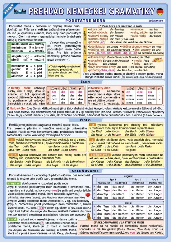 Kompletný prehľad nemeckej gramatiky v prehľadnom formáte A4, ideálny pre žiakov základných i stredných škôl.