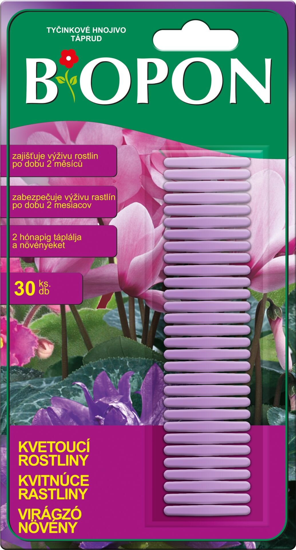 Patyczki nawozowe Biopon dla roślin kwitnących dostarczają składników odżywczych przez 2 miesiące. Łatwo przyswajalny nawóz odpowiada zapotrzebowaniu roślin kwitnących na substancje odżywcze. Każdy patyczek zawiera odpowiednią ilość fosforu i potasu. Pobudza rośliny do tworzenia pąków, dzięki czemu intensywnie kwitną.