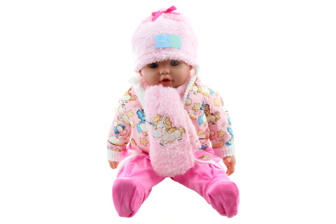 Duża lalka - niemowlę dziewczynka - z miękkim ciałem o wymiarach ok. 50 x 27 x 13 cm. Ubranko można zdjąć. Materiały: plastik + poliester + wypełnienie. Końcówki kończyn i głowa są z plastiku. Pakowana w woreczek. Wiek 3+ przeczytaj całość