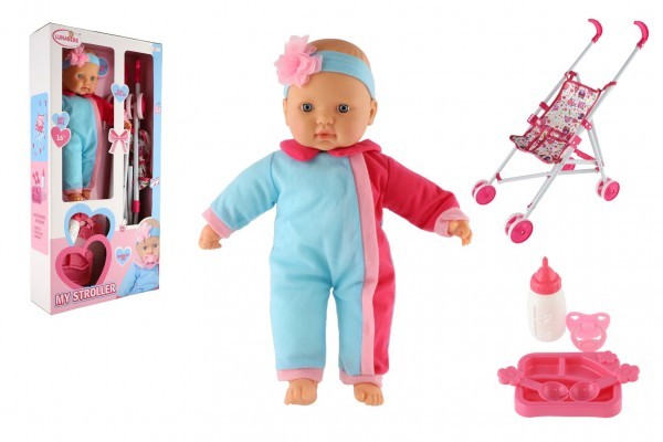 Panenka miminko 38cm měkké tělo s doplňky s kočárkem v krabici 32x64x11cm