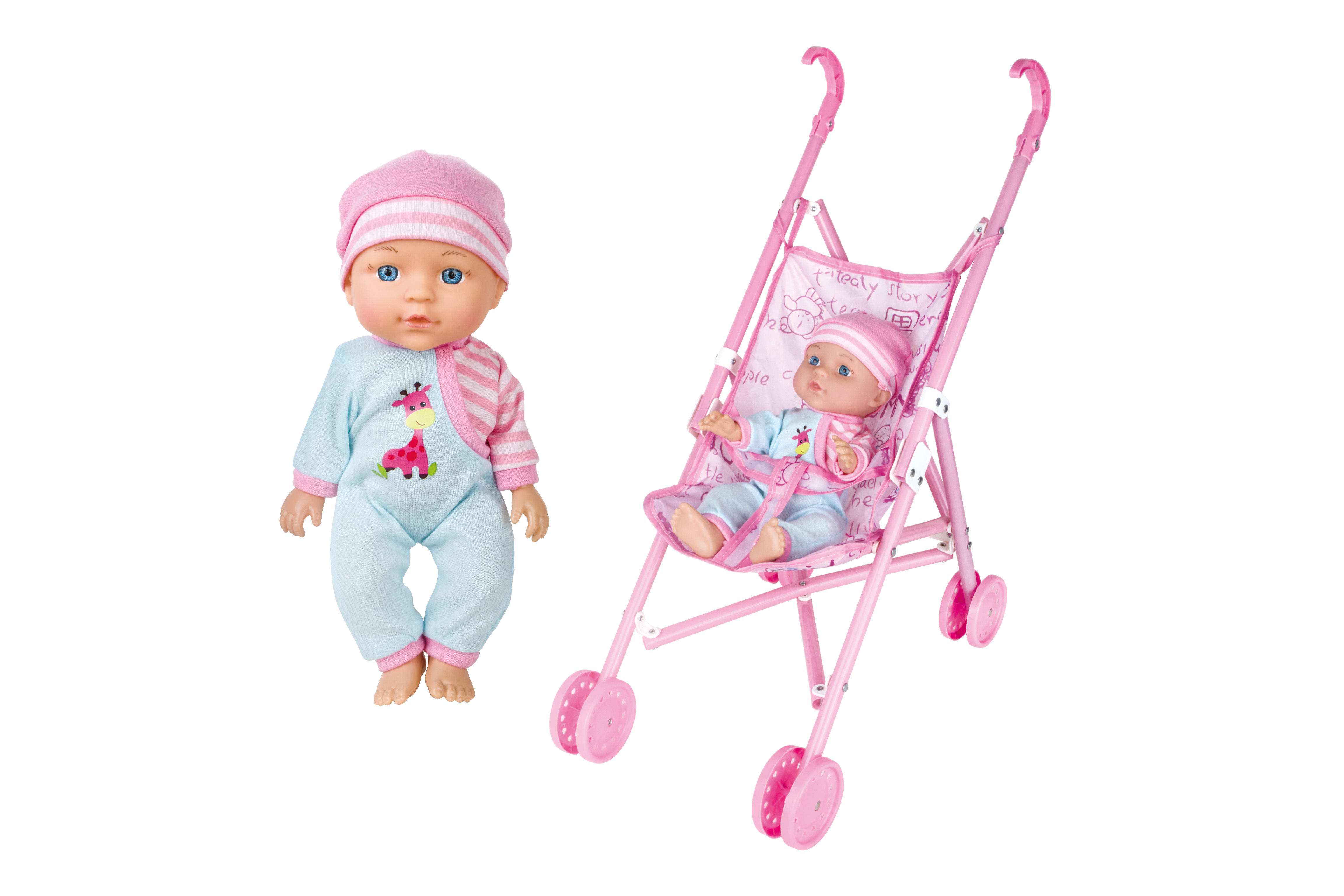 Miminko se zvuky a kočárkem. Velikost 27 cm. Balení obsahuje miminko, složený kočárek, mističku s příborem, nočník, lahvičku. Po zmáčknutí bříška zvukové efekty. 3xAG13 baterie součástí. przeczytaj całość