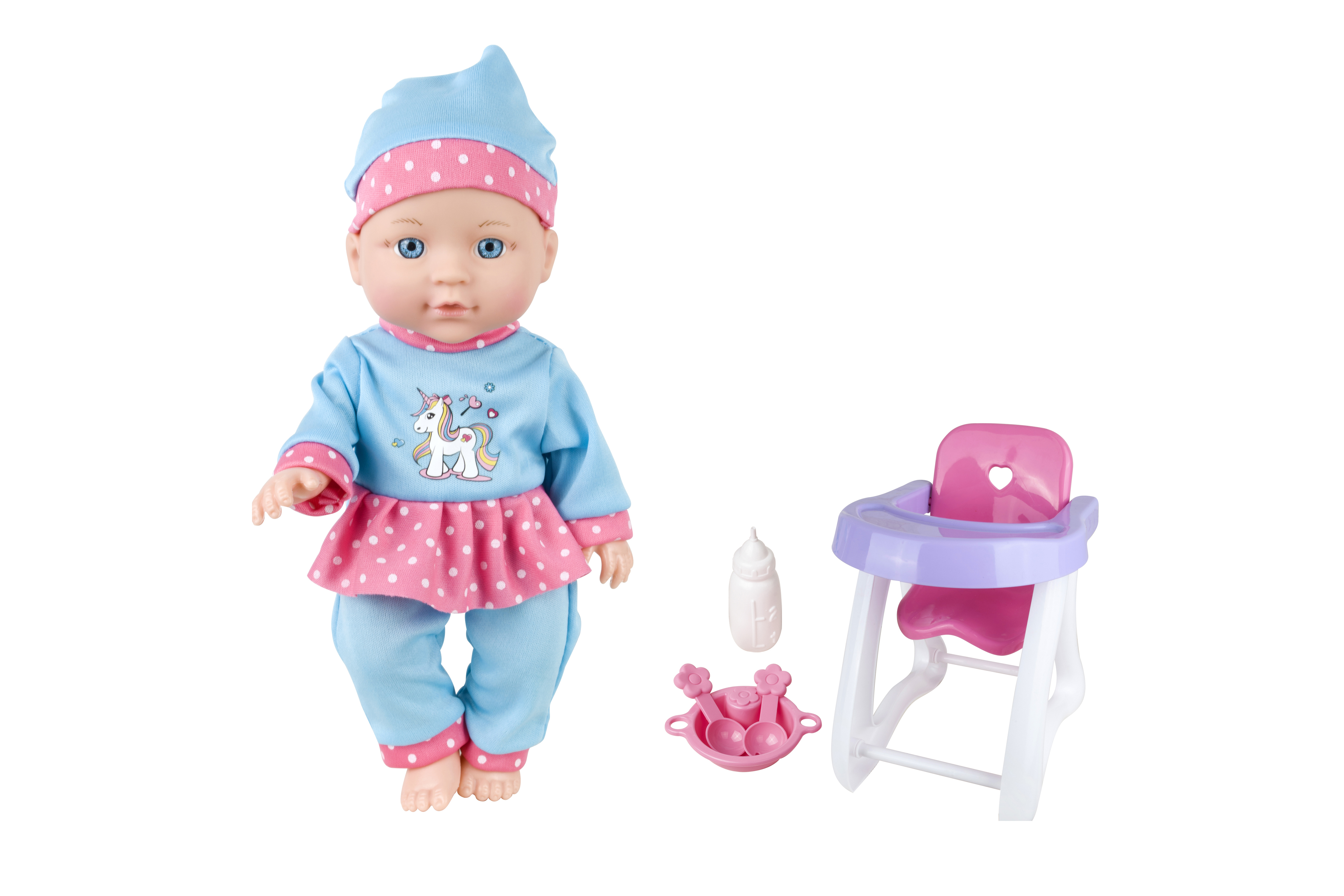 Miminko s židličkou a příslušenstvím. Velikost 30 cm. Balení obsahuje jídelní židličku, misku s lžičkou a vidličkou, lahvičku. przeczytaj całość