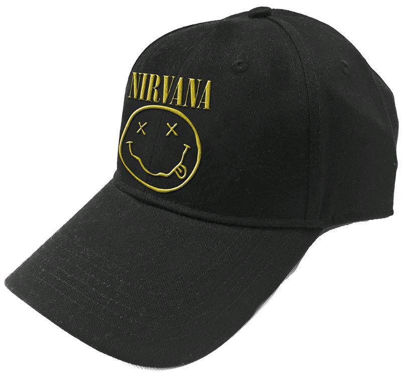 Oficiální kšiltovka z fashion katalogu módního a doplňkového zboží americké hard-rockové skupiny Nirvana.Zboží je legálně licencováno a prodáváno se souhlasem vlastníků licenčních práv.Černá baseballová kšiltovka se žlutým logem a grafikou Keep smiling - americké hard - rockové skupiny...