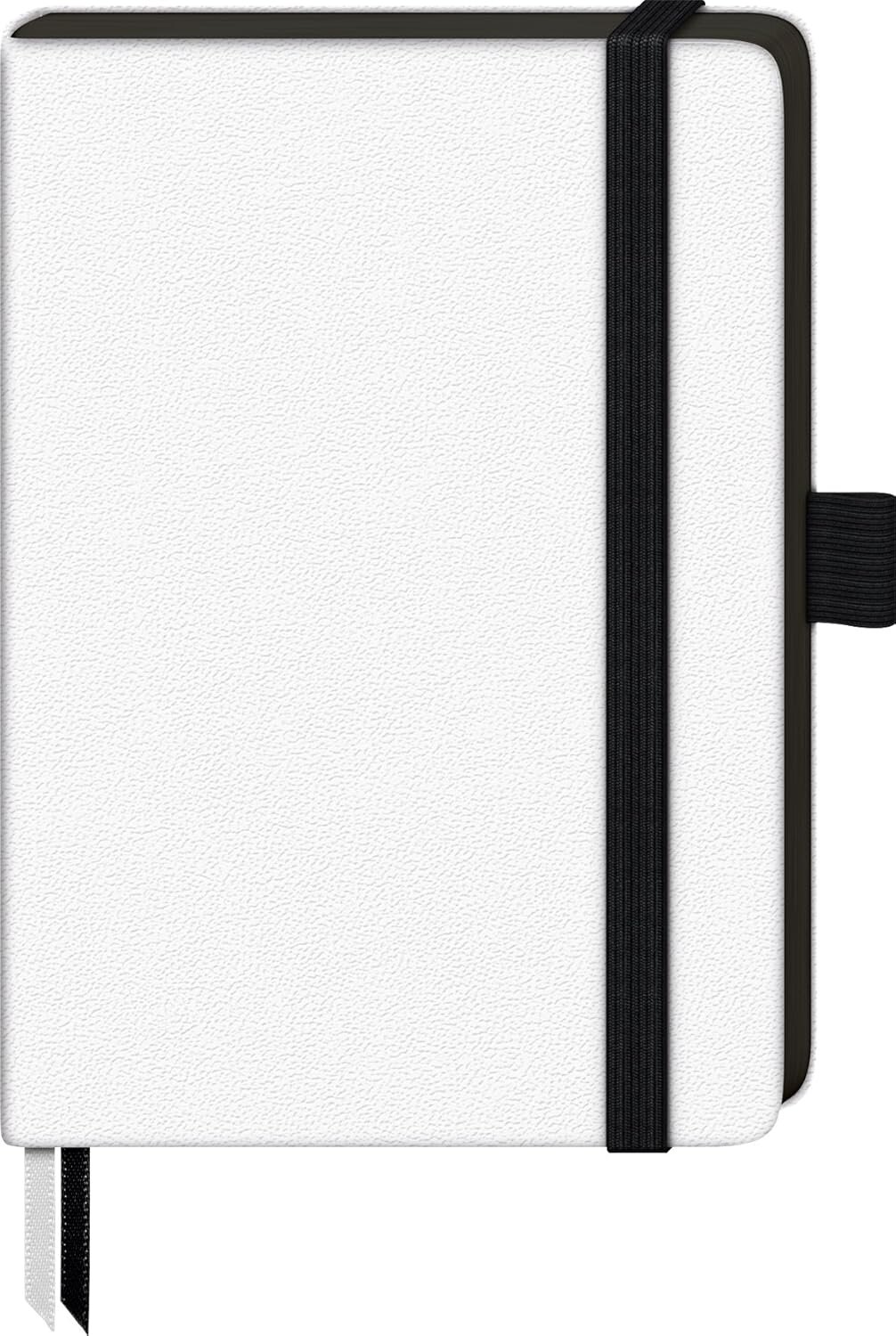 Elegancki notes Brunnen Kompagnon z białą twardą oprawą o wymiarach 9,5 x 12,8 cm. Szyty nicią, posiada 192 strony, w tym 16 stron do odrywania, z numeracją stron i papierem o gramaturze 80 g/m2. Kremowy papier z czarnym brzegiem. Uchwyt na długopis, zamykany gumką. Na tylnej okładce znajduje się kieszeń na papier, 2 samoprzylepne etykiety, 1 identyfikator i 2 etykiety do oznaczania grzbietu.
