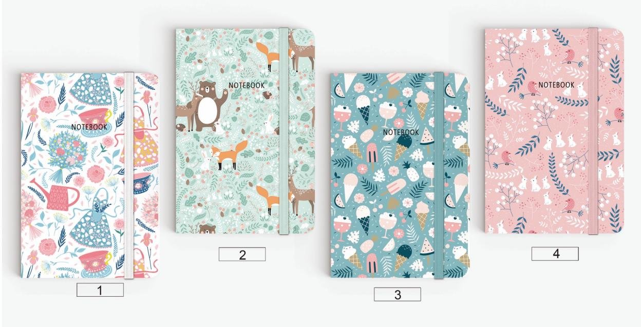 Notatnik 96 kartkowy z gumką w twardej okładce. Format A6. Wymiar 14.5x10.5 cm. Mix wzorów, towar wysyłany losowo. przeczytaj całość