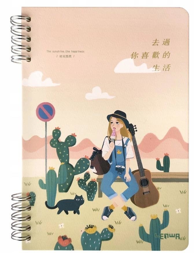 Kołonotes A5 w twardej oprawie z kolorowym rysunkiem przedstawiającym siedzącą na ławce długowłosą dziewczynę w kapeluszu z plecakiem i gitarą. Posiada 80 kartek w linie o gramaturze 70 gsm. przeczytaj całość
