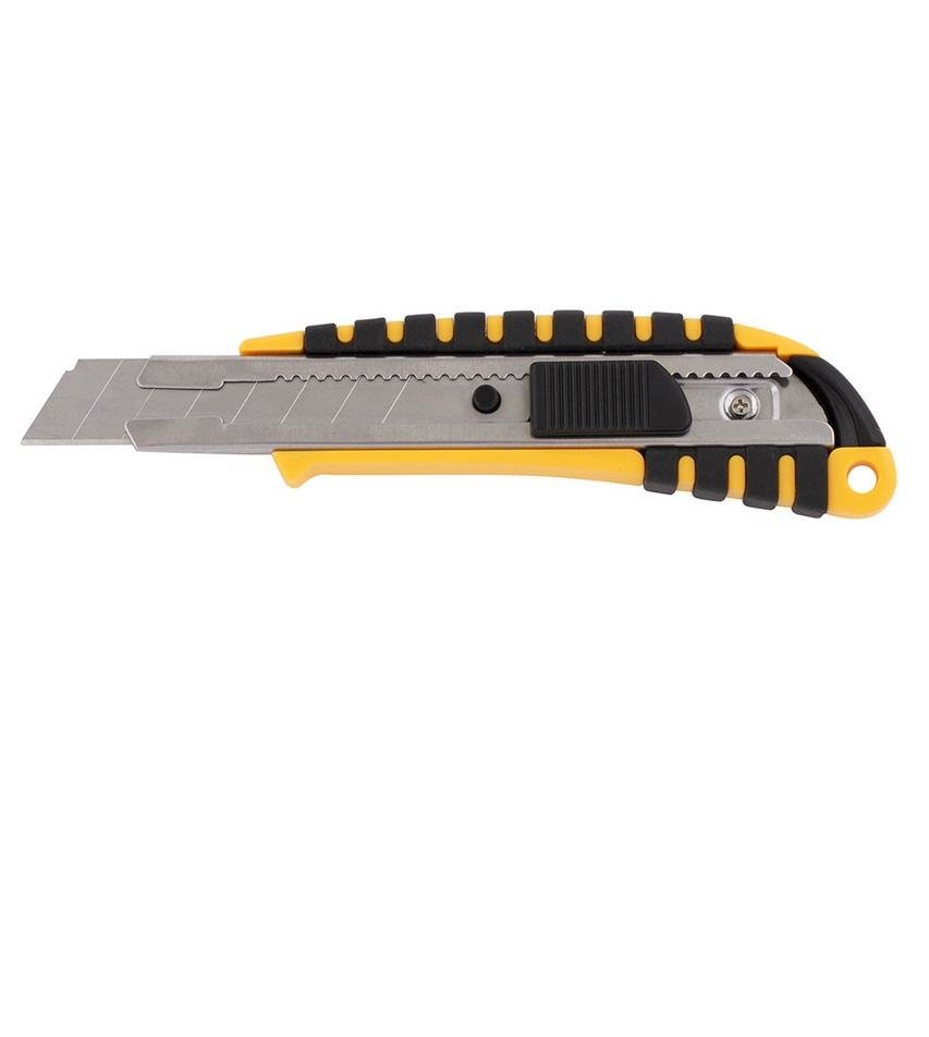 wzmocniony z ostrzem prowadzonym w metalowej szynie- automatyczna blokada położenia ostrza- ergonomiczna, wykonana z niełamliwego plastiku obudowa- gumowy żebrowany uchwyt- rozmiar ostrza: 100 x 18 mm przeczytaj całość