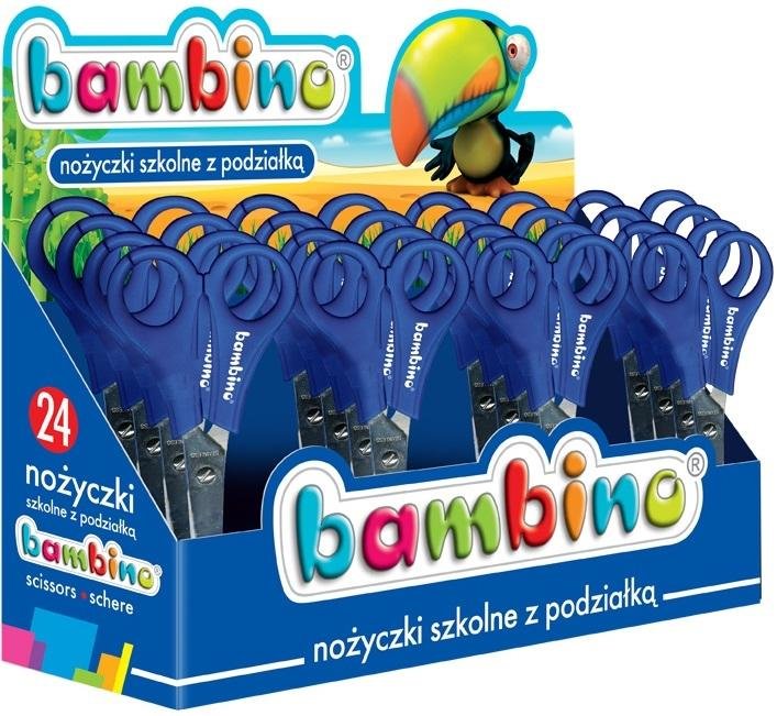 Nożyczki dziecięce z podziałką do użytku przedszkolnego, szkolnego czy domowego. Plastikowa, kolorowa, wygodnie wyprofilowana rączka idealnie pasuje do małych dłoni dziecka. Bezpieczeństwo użytkowania podnoszą zaokrąglone końce. Ekspozycję produktu w punkcie sprzedaży ułatwia estetyczny display zawierający 24 sztuki nożyczek. Licencja - Bambino.