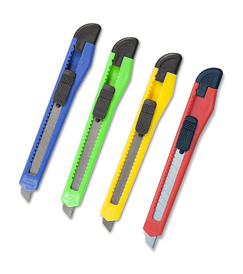 Odlamovací nůž s plastovým tělem, mix barev, možnost výměny nožů, uzavírací pojistka, protiskluzový povrch, šířka čepele 9mm. Délka 13 cm. przeczytaj całość