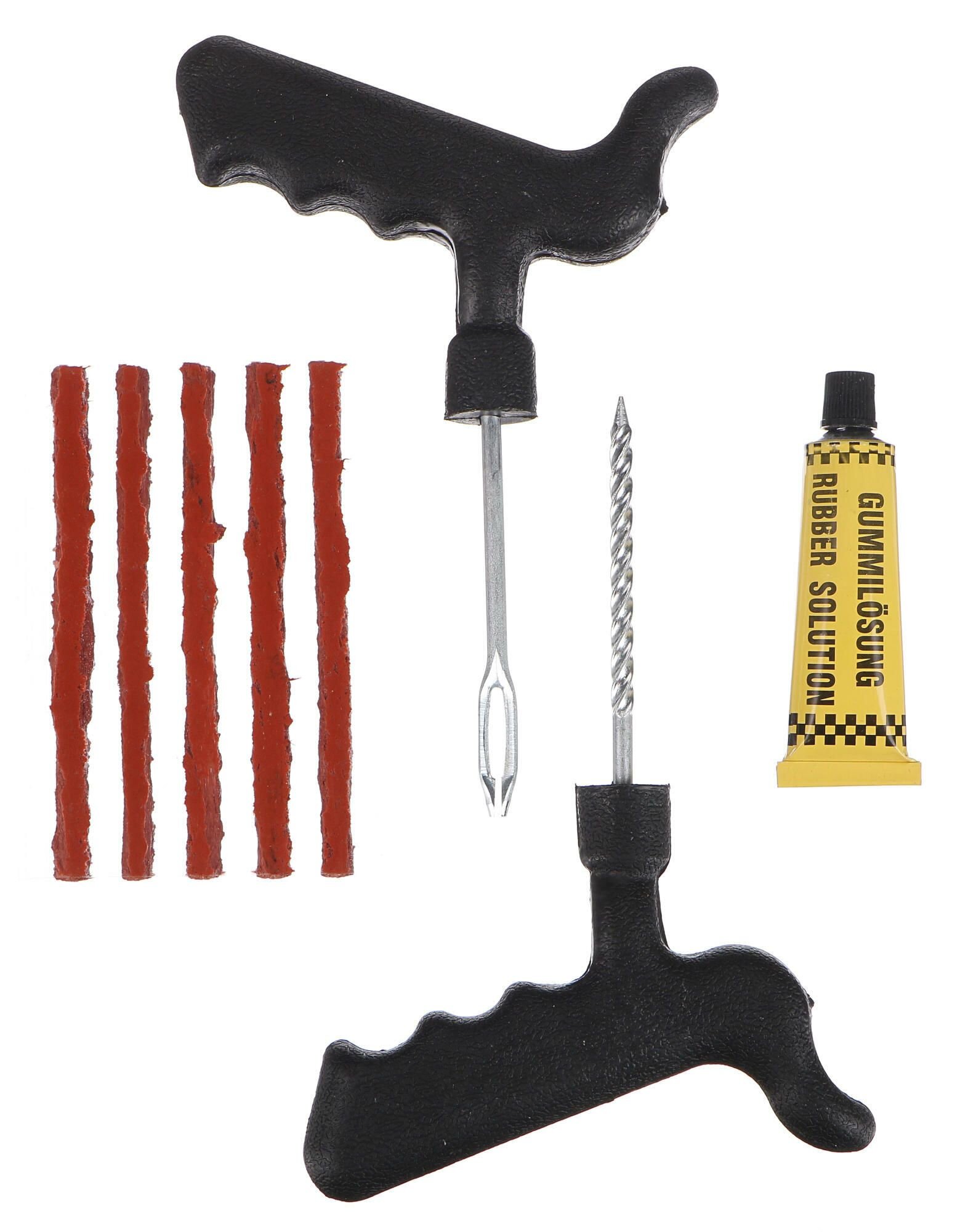 Instrukcja użycia: Znajdź miejsce przebicia opony, ewentualnie usuń przedmiot, który spowodował uszkodzenie. Wsuń rozwiertak w otwór, a następnie przeciągaj go w górę i w dół - aż będzie łatwo przechodził przez otwór - w ten sposób otwór zostanie oczyszczony i przygotowany. Knot pozbawiony ochronnej folii przełóż przez widlicę i nałóż na niego roztwór wulkanizacyjny. Włóż widlicę z nałożonym knotem do otworu tak, aby jego połowa pozostała po zewnętrznej stronie opony, następnie obróć widlicę i powoli ją wyciągnij. Odetnij nadmiar knotu jak najbliżej opony.