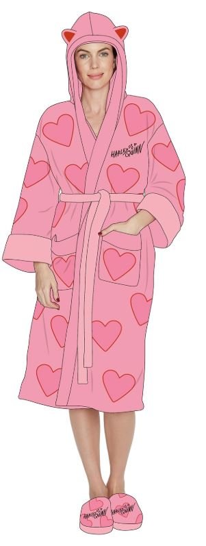 Oficiální výrobek - dámský župan z katalogu oblečení a módních doplňků s licencí fiktivní komiksové postavy Harley Quinn od vydavatelství DC Comics.Zboží je legálně licencováno a prodáváno se souhlasem vlastníků licenčních práv.Kvalitní růžový dámský župan s kapucí a páskem pro všechny milovníky...