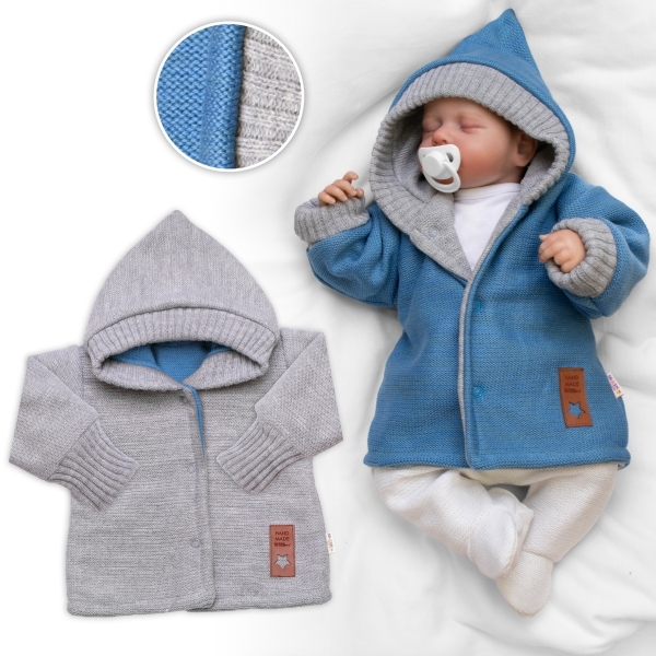 Rostoucí oboustranný svetřík s kapucí Hand Made, modrá-šedá; 56/62 (0-3m)