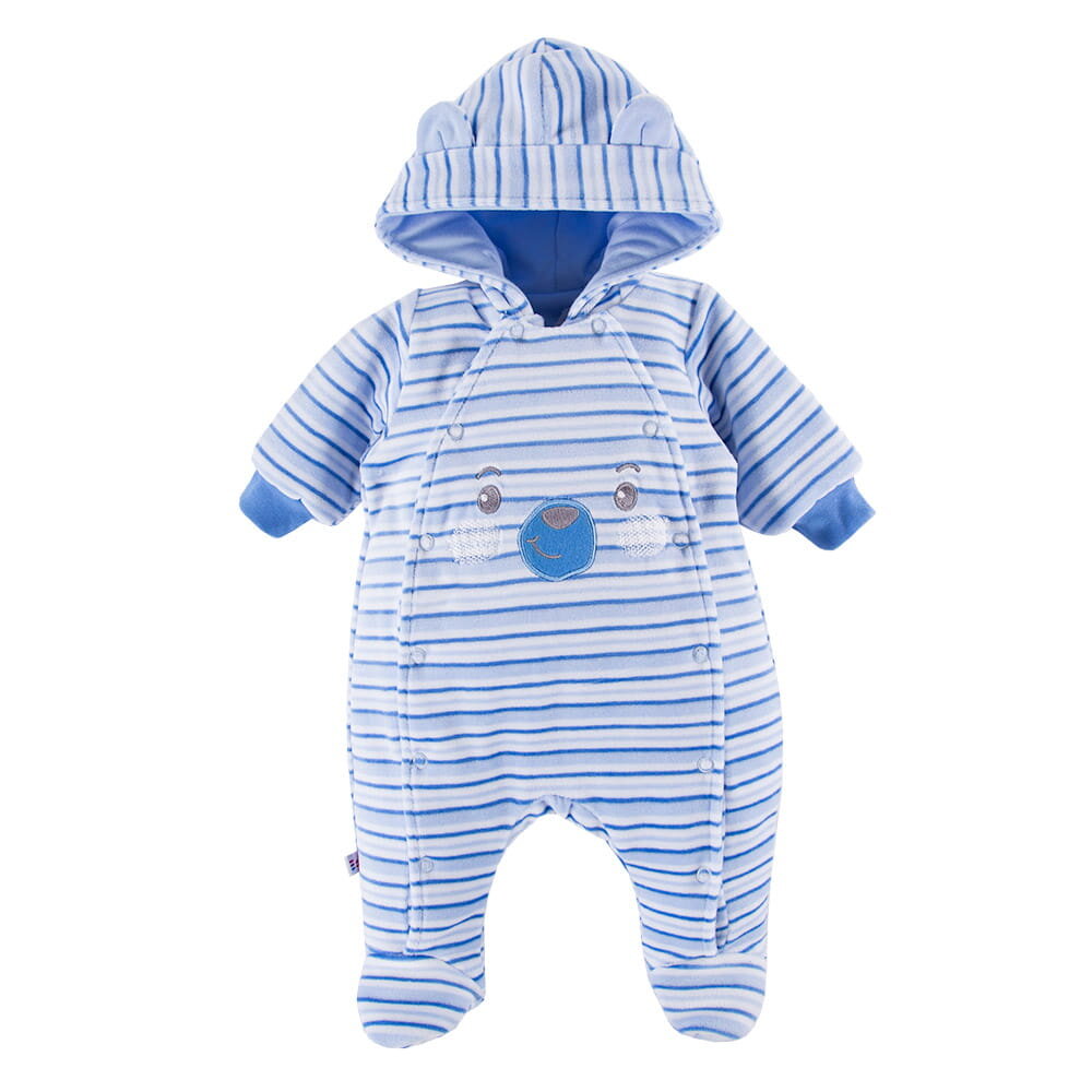 Kombinezon dziecięcy niebieski wykonany z ciepłego weluru. Kombinezon dziecięcy posiada kaptur i urocze uszka. Podszewka w kombinezonie wykonana jest w 100% z bawełny. Pajacyk z kapturem będzie idelany na wyjście ze szpitala w chłodne miesiące. W wyprawce dla dzieci rodzących się zimą i jesienią...