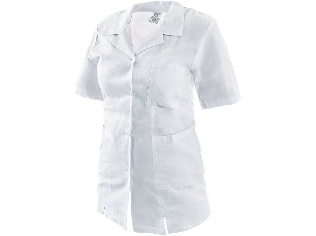 Dámská halena s krátkým rukávem, vypasovaný střih, 3 kapsy, kapsa na tužku, vzadu volný pásek s knoflíkem na stáhnutí. przeczytaj całość