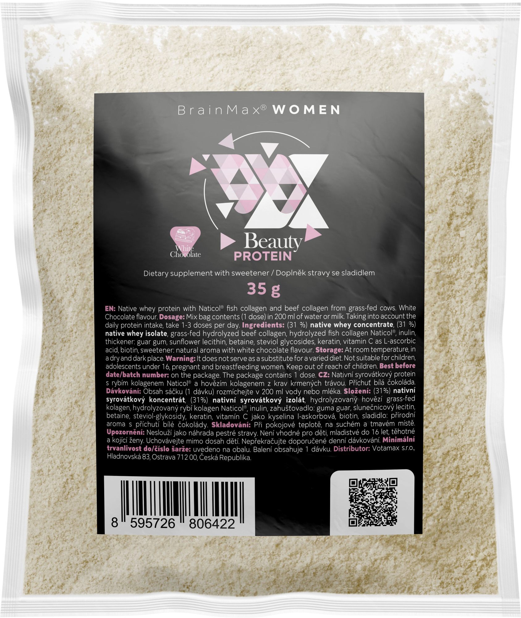 Díky pečlivě vybranému složení už nemusíte kupovat samostatně protein, kolagen a řešit suplementaci keratinu a biotinu – Vše je zahrnuto v efektivních dávkách, podloženými studiemi. S naším Women Beauty Proteinem získáte vše potřebné pro vaši krásu a zdraví v jednom, za méně než poloviční cenu. Jedinečný produkt kombinuje výhody klíčových složek do jedné efektivní, poskytující komplexní péči, která je ideální pro každodenní použití. Navržen speciálně pro potřeby ženského těla, podporuje zdraví pokožky, posilnění vlasů a zpevnění nehtů, zatímco současně napomáhá udržovat svalovou sílu, celkovou vitalitu a redukci tělesného tuku. Díky tomuto vzniká přírodní řešení krásy, které při pravidelném užívání spolu s BrainMax Beauty Bomb přináší dlouhodobější výsledky než mnohem dražší invazivní procedury.