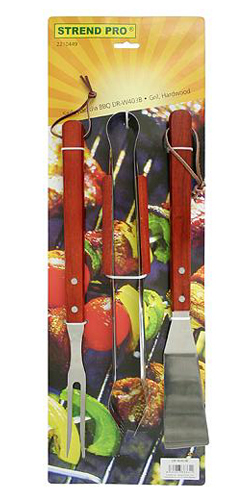 Zestaw narzędzi do grillowania BBQ, 3 elementy. Zestaw narzędzi do grillowania wykonany jest ze stali nierdzewnej z uchwytami z twardego drewna. Zawartość opakowania: szpatułka, widelec do nadziewania, płaska łyżka.