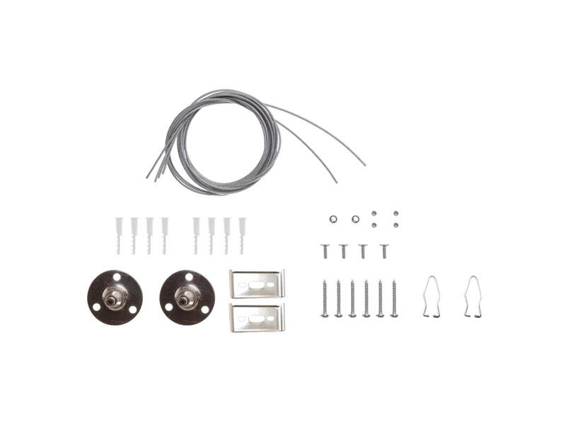 Balení obsahuje: 2 svorky pro připevnění k panelu, 2 potažené ocelové kabely, 2 kabelové průchodky s kabelovými sponami, 6 šroubů a 6 kotev pro upevnění a nakonec 2 desky pro připevnění ke zdi pomocí pružinové kabelové svorky. Oba dodávané kabely jsou dlouhé 101,5 cm. Tato konkrétní sada umožňuje zavěšení led trubic a stropních světel pro lineární led trubice v maximální vzdálenosti 1 metru od stropu.
