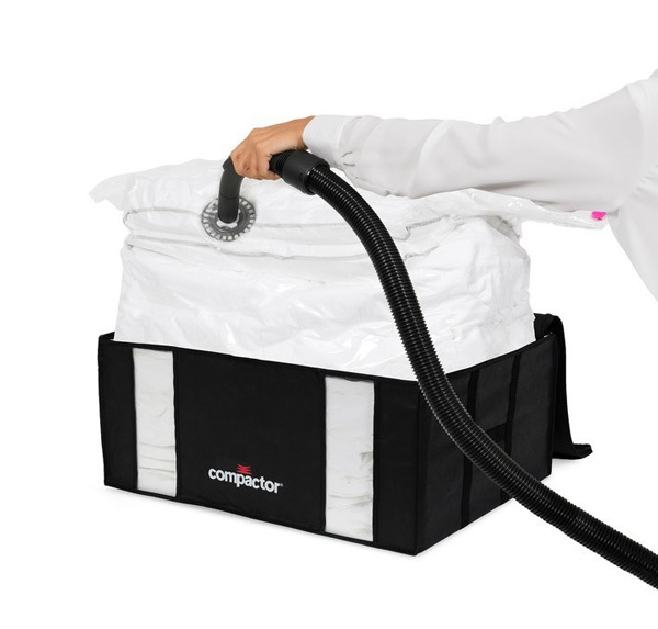 Inovovaný odsávací ventil je kompatibilní se všemi domácími vysavači (včetně vysavačů Dyson) a je navržen tak, aby zajistil optimální sání. Ventil je pouze jednocestný, proto po odsátí vzduchu nedochází k opětovnému nafouknutí vaku. Úložné vakuové boxy Compactor jsou 100 % hermeticky uzavíratelné , což zajišťuje spolehlivý plastový zip s jezdcem. Svoji roli v dokonalé ochraně hraje také vysoce pevný nylon a polyethylen, ze kterého jsou pytle vyrobeny. Díky těmto vlastnostem jsou uložené textilie chráněné před působením vnějších škodlivých vlivů jako jsou plíseň, vlhkost, roztoči, moli či prach. Vnější pouzdro je navrženo tak, aby uskladněné věci zabraly nejen co nejméně místa, ale aby také dobře vypadalo. Vnitřní vak se po kompresi přizpůsobí tvaru pouzdra a díky tomu je lze také snadno stohovat. Moderní design umožňuje skladovat věci úhledně třeba i na očích. Je vyrobeno z vyztužené netkané textilie a lze ho v případě potřeby ručně vyprat. Obsah pouzdra lze zajistit integrovaným stahovacím popruhem pro snadné skladování i ve vertikální poloze. Pouzdro je po vrchním obvodu opatřeno zipem a praktičnost celému modelu dodávají zesílené rukojeti pro komfortní manipulaci. Transparentní okénka na přední straně zajišťují snadnou identifikaci uložených věcí.
