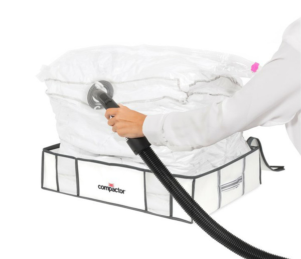 Inovovaný odsávací ventil je kompatibilní se všemi domácími vysavači (včetně vysavačů Dyson) a je navržen tak, aby zajistil optimální sání. Ventil je pouze jednocestný, proto po odsátí vzduchu nedochází k opětovnému nafouknutí vaku. Úložné vakuové boxy Compactor jsou 100 % hermeticky uzavíratelné , což zajišťuje spolehlivý plastový zip s jezdcem. Svoji roli v dokonalé ochraně hraje také vysoce pevný nylon a polyethylen, ze kterého jsou pytle vyrobeny. Díky těmto vlastnostem jsou uložené textilie chráněné před působením vnějších škodlivých vlivů jako jsou plíseň, vlhkost, roztoči, moli či prach. Vnější pouzdro je navrženo tak, aby uskladněné věci zabraly nejen co nejméně místa, ale aby také dobře vypadalo. Vnitřní vak se po kompresi přizpůsobí tvaru pouzdra a díky tomu je lze také snadno stohovat. Moderní design umožňuje skladovat věci úhledně třeba i na očích. Je vyrobeno z vyztužené netkané textilie a lze ho v případě potřeby ručně vyprat. Obsah pouzdra lze zajistit integrovaným stahovacím popruhem pro snadné skladování i ve vertikální poloze. Pouzdro je po vrchním obvodu opatřeno zipem a praktičnost celému modelu dodávají zesílené rukojeti pro komfortní manipulaci. Transparentní okénka na přední straně zajišťují snadnou identifikaci uložených věcí.