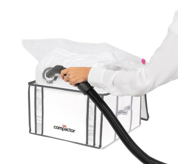 Inovovaný odsávací ventil je kompatibilní se všemi domácími vysavači (včetně vysavačů Dyson) a je navržen tak, aby zajistil optimální sání. Ventil je pouze jednocestný, proto po odsátí vzduchu nedochází k opětovnému nafouknutí vaku. Úložné vakuové boxy Compactor jsou 100 % hermeticky uzavíratelné , což zajišťuje spolehlivý plastový zip s jezdcem. Svoji roli v dokonalé ochraně hraje také vysoce pevný nylon a polyethylen, ze kterého jsou pytle vyrobeny. Díky těmto vlastnostem jsou uložené textilie chráněné před působením vnějších škodlivých vlivů jako jsou plíseň, vlhkost, roztoči, moli či prach. Vnější pouzdro je navrženo tak, aby uskladněné věci zabraly nejen co nejméně místa, ale aby také dobře vypadalo. Vnitřní vak se po kompresi přizpůsobí tvaru pouzdra a díky tomu je lze také snadno stohovat. Moderní design umožňuje skladovat věci úhledně třeba i na očích. Je vyrobeno z vyztužené netkané textilie a lze ho v případě potřeby ručně vyprat. Obsah pouzdra lze zajistit integrovaným stahovacím popruhem pro snadné skladování i ve vertikální poloze. Pouzdro je po vrchním obvodu opatřeno zipem a praktičnost celému modelu dodávají zesílené rukojeti pro komfortní manipulaci. Transparentní okénka na přední straně zajišťují snadnou identifikaci uložených věcí.