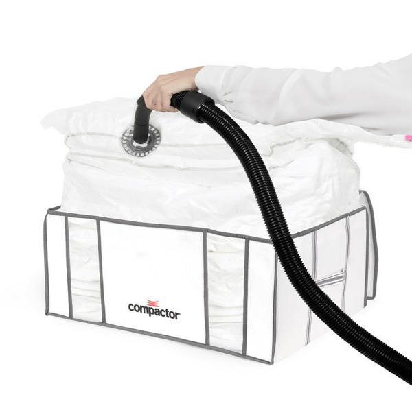 Inovovaný odsávací ventil je kompatibilní se všemi domácími vysavači (včetně vysavačů Dyson) a je navržen tak, aby zajistil optimální sání. Ventil je pouze jednocestný, proto po odsátí vzduchu nedochází k opětovnému nafouknutí vaku. Úložné vakuové boxy Compactor jsou 100 % hermeticky uzavíratelné , což zajišťuje spolehlivý plastový zip s jezdcem. Svoji roli v dokonalé ochraně hraje také vysoce pevný nylon a polyethylen, ze kterého jsou pytle vyrobeny. Díky těmto vlastnostem jsou uložené textilie chráněné před působením vnějších škodlivých vlivů jako jsou plíseň, vlhkost, roztoči, moli či prach. Vnější pouzdro je navrženo tak, aby uskladněné věci zabraly nejen co nejméně místa, ale aby také dobře vypadalo. Vnitřní vak se po kompresi přizpůsobí tvaru pouzdra a díky tomu je lze také snadno stohovat. Moderní design umožňuje skladovat věci úhledně třeba i na očích. Je vyrobeno z vyztužené netkané textilie a lze ho v případě potřeby ručně vyprat. Obsah pouzdra lze zajistit integrovaným stahovacím popruhem pro snadné skladování i ve vertikální poloze. Pouzdro je po vrchním obvodu opatřeno zipem a praktičnost celému modelu dodávají zesílené rukojeti pro komfortní manipulaci. Transparentní okénka na přední straně zajišťují snadnou identifikaci uložených věcí.