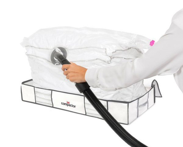 Inovovaný odsávací ventil je kompatibilní se všemi domácími vysavači (včetně vysavačů Dyson) a je navržen tak, aby zajistil optimální sání. Ventil je pouze jednocestný, proto po odsátí vzduchu nedochází k opětovnému nafouknutí vaku. Úložné vakuové boxy Compactor jsou 100 % hermeticky uzavíratelné , což zajišťuje spolehlivý plastový zip s jezdcem. Svoji roli v dokonalé ochraně hraje také vysoce pevný nylon a polyethylen, ze kterého jsou pytle vyrobeny. Díky těmto vlastnostem jsou uložené textilie chráněné před působením vnějších škodlivých vlivů jako jsou plíseň, vlhkost, roztoči, moli či prach. Vnější pouzdro je navrženo tak, aby uskladněné věci zabraly nejen co nejméně místa, ale aby také dobře vypadalo. Vnitřní vak se po kompresi přizpůsobí tvaru pouzdra a díky tomu je lze také snadno stohovat. Moderní design umožňuje skladovat věci úhledně třeba i na očích. Je vyrobeno z vyztužené netkané textilie a lze ho v případě potřeby ručně vyprat. Obsah pouzdra lze zajistit integrovaným stahovacím popruhem pro snadné skladování i ve vertikální poloze. Pouzdro je po vrchním obvodu opatřeno zipem a praktičnost celému modelu dodávají zesílené rukojeti pro komfortní manipulaci. Transparentní okénka na přední straně zajišťují snadnou identifikaci uložených věcí.