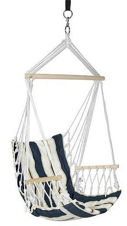 Závěsné houpací křeslo CRAIG s bavlněnou poduškou a dřevěnými opěrkami na ruce. Parametry - nosnost max. 150kg, šířka sedáku 50cm, výška po dřevěný rám 100cm, barva - modrá, hmotnost 2,13kg. przeczytaj całość