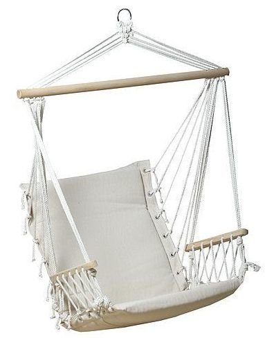Závěsné houpací křeslo CRAIG s bavlněnou poduškou a dřevěnými opěrkami na ruce. Parametry - nosnost max. 150 kg, šířka sedáku 50 cm, výška po dřevěný rám 100 cm, barva - béžová, hmotnost 2,13 kg. przeczytaj całość