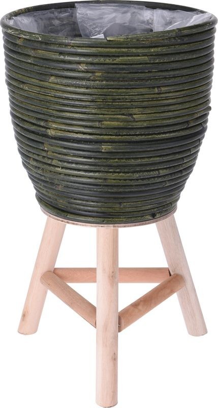 Květináč ratanový na dřevěné noze 24,5 x 41 cm zelená