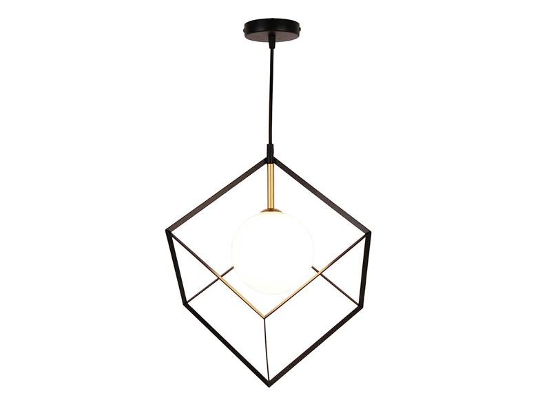 Svítidlo inspirované industriálním stylem ve tvaru krychle, vyrobená z kovu v černé a zlaté barvě, s bílým skleněným stínidlem uvnitř. Ideální do obývacího pokoje, kuchyně, jídelny, kanceláře, ložnice, pokoje pro mládež.